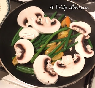 Les fanes avaient rendu de l'eau. J'en ai profité pour y faire cuire une petite poignée d'haricots verts et les tranches d'un gros champignon. J'ai ajouté 3 kumquats en lamelles (j'avoue avoir été inspirée par la cuisine du chef du MAYA, Eloi Spinnler que je vais souvent copier), et des morceaux de rhubarbe (parce que j'en avais sous la min, mais ça marche très bien et on y pense pas assez).