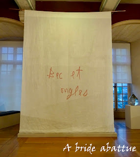 Plus loin, placée juste à droite de l'immense broderie Bec et ongles, la Dame-Jeanne (jarre de verre remplie de l'eau de l'Iton) porte le "Jouffu" comme un enfant à naitre. Le fragment en suspens dans la panse de verre expose la rondeur des traits d'un très jeune enfant aux prises avec la dureté de ses contours.